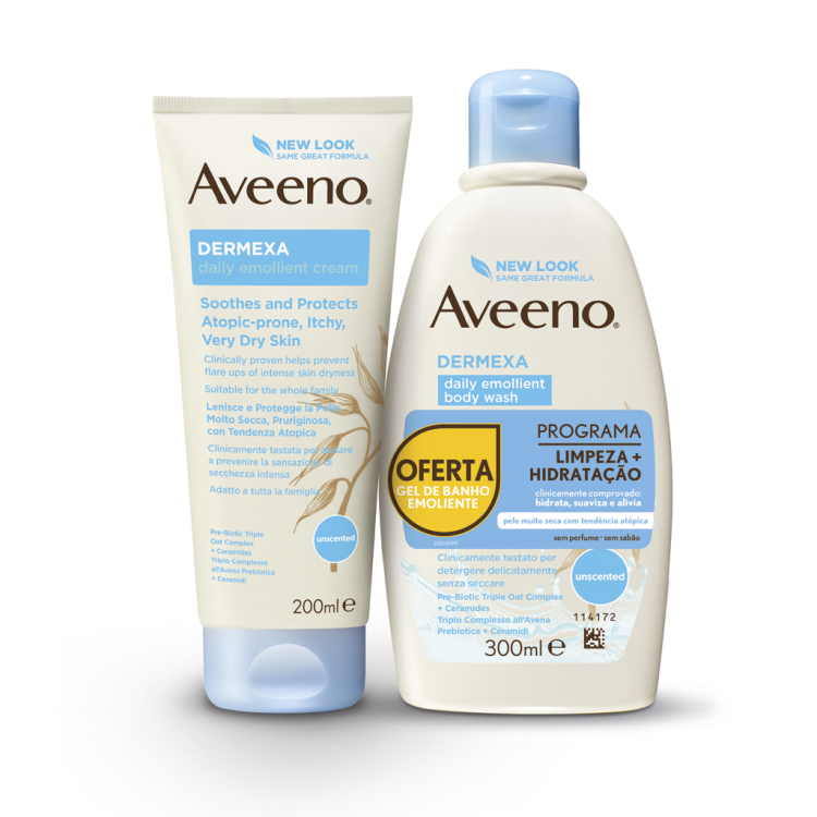 Aveeno Dermexa Creme Emoliente 200ml + Gel Banho Emoliente 300ml é um conjunto de cuidados com a pele criado para ajudar a acalmar e aliviar a pele seca e irritada. Este conjunto inclui um Creme Emoliente de 200ml e um Gel de Banho Emoliente de 300ml. Aveeno Dermexa Creme Emoliente 200ml + Gel Banho Emoliente 300ml são formulados para ajudar a hidratar, suavizar e proteger a pele, tornando-os ideais para pessoas com pele seca, sensível ou propensa a irritações. O Creme Emoliente é ideal para o uso diário, proporcionando uma hidratação profunda, enquanto o Gel de Banho Emoliente é suave o suficiente para uso diário na limpeza da pele. Juntos, esses produtos ajudam a manter a pele com uma sensação de conforto e bem-estar, restaurando a hidratação e a barreira protetora da pele. Adequados para adultos e crianças, esses produtos Aveeno Dermexa são uma opção eficaz para o cuidado da pele seca e irritada. Características: Hidrata profundamente a pele seca e irritada. Ajuda a aliviar a coceira e a sensação de desconforto. Reforça a barreira protetora da pele. Fórmula suave e sem fragrâncias agressivas. Limpa suavemente a pele sem remover a hidratação natural. Ajuda a manter a pele macia e hidratada. Fórmula suave, adequada para uso diário.