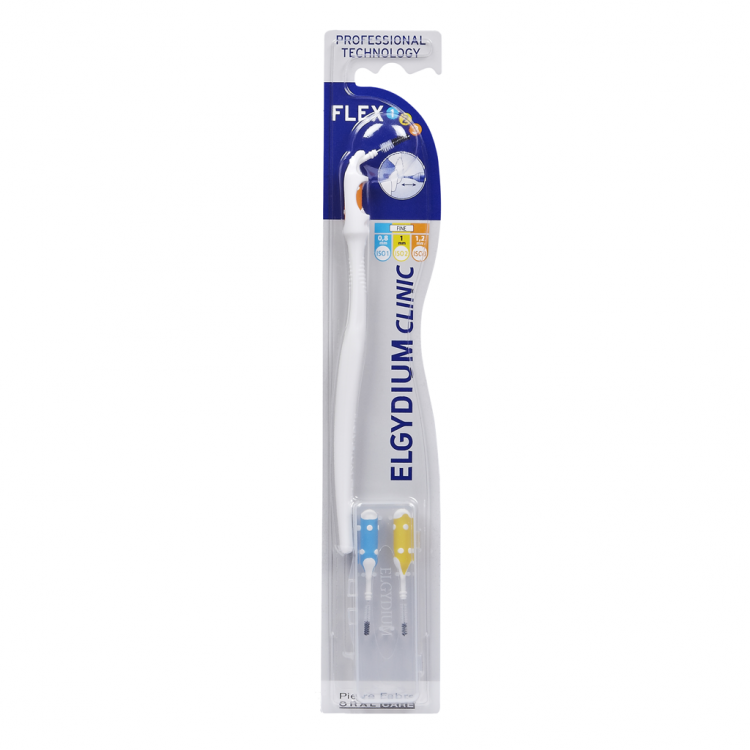 ELGYDIUM CLINIC ESCOVILHÃO FLEX é um escovilhão de cabo longo, que permite uma utilização das diferentes medidas de escovilhões ELGYDIUM CLINIC em duas posições, para uma higiene fácil e otimizada de todos os espaços interdentários: inclinação 120° (para os espaços posteriores) e 180° (para os espaços anteriores).