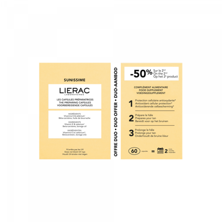 Lierac Sunissime Cápsulas Bronzeado é um suplemento, que ajuda a preparar, ativar e estimular para um bronzeado sublime. Estimula a produção de melanina. Prepara a pele para um bronzeado mais rápido, intenso e duradouro. Protege as células contra o stress oxidativo. Previne o envelhecimento cutâneo. Ideal para todo o tipo de pele, inclusive a mais sensível.