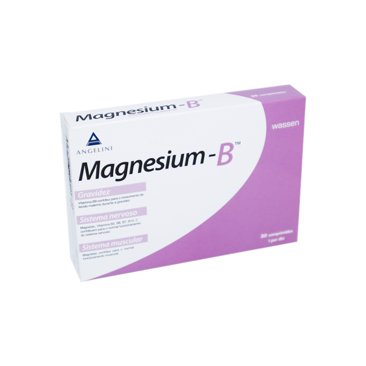 Magnesium B contém magnésio e vitaminas B2, B3, B5, B6, B9, B12 e C contribuem para a redução do cansaço e da fadiga. O magnésio contribui ainda para a normal função psicológica, assim como as vitaminas B1, B3, B6, B7, B12 e C. A vitamina B5 contribui para um desempenho mental normal. A vitamina B9 contribui para o crescimento do tecido materno durante a gravidez. O magnésio e as vitaminas B2, B5, B6, B7, B12 e C contribuem para o normal metabolismo produtor de energia. estes elementos (à excepção da vitamina B5) contribuem também para o normal funcionamento do sistema nervoso. O magnésio tem ainda a vantagem de contribuir para o normal funcionamento muscular. Isento de glúten, derivados de leite, lactose e sacarose. Adequado a vegetarianos.