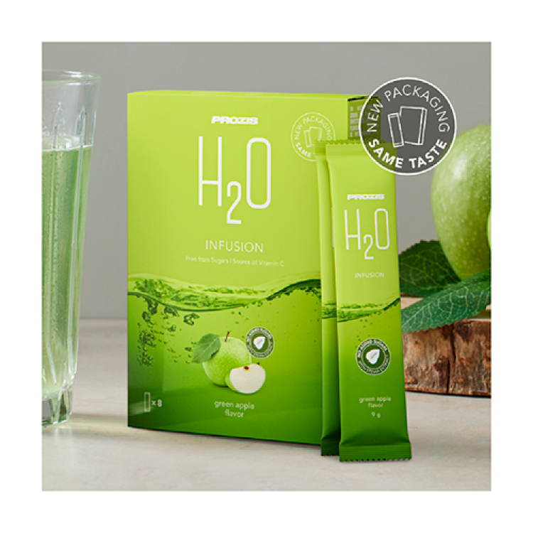 A sua hidratação favorita, enriquecida com vitamina C Qualquer altura é boa para beber água. Mas água com um sabor especial sabe sempre melhor, por isso, é natural que beba mais! Dê um toque frutado à sua água e desfrute da sua rotina diária com a melhor H2O. Uma alternativa divertida e deliciosa! Escolha o seu sabor favorito, enriquecido com vitamina C. Destinado a: - Pessoas ativas; - Atletas; - Pessoas que se preocupam com a sua saúde; - Idosos. A vitamina C tem um papel importante: - Na formação de colagénio para o normal funcionamento da pele; - Na manutenção do normal funcionamento do sistema imunitário; - Na formação de colagénio para funcionamento normal dos vasos sanguíneos; - No metabolismo normal de produção de energia; - Na normal formação de colagénio para normal funcionamento de ossos e cartilagem; - Na formação normal de colagénio para o normal funcionamento de gengivas e dentes; - No normal funcionamento do sistema nervoso e na normal função psicológica; - Na proteção das células contra as oxidações indesejáveis; - Na redução do cansaço e da fadiga; - Na regeneração da forma reduzida da vitamina E. E porque não beber esta água saudável e revigorante em festas, piqueniques e outras ocasiões especiais? É uma ótima alternativa às bebidas açucaradas nas festas das crianças! Ao contrário de outras bebidas solúveis em pó, a Prozis H2O, quando dissolvida em 1,5 L de água, tem 0 g de açúcares! Sabor a maçã verde.