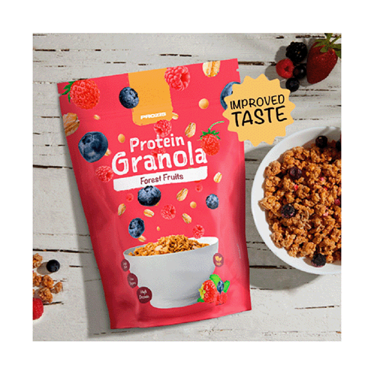 Uma mistura que contém vários ingredientes valiosos: flocos de aveia integral, isolado de proteína de soja e farelo de aveia, além de mirtilos, morangos e framboesas. A Protein Granola da Prozis fornece-te um vasto conjunto de nutrientes que te preparam para arrasar e enfrentar o teu dia. Contém uma quantidade saudável de fibra, hidratos de carbono complexos e outros nutrientes, enquadrando-se perfeitamente na tua dieta equilibrada. Não só contribui para o crescimento e a manutenção da massa muscular, como também ajuda na manutenção de ossos normais. Enquanto outras granolas podem ter teores de açúcares elevados e tendem a focar-se mais nos hidratos de carbono, a Protein Granola da Prozis gosta de fazer as coisas de forma diferente. Afinal de contas, é um produto Prozis!