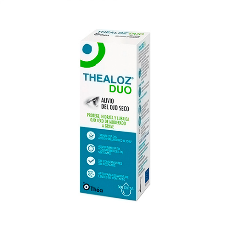 Solução ocular indicado para o tratamento do olho seco moderado a grave, quando já existem sinais ou sintomas de desconforto, sensação de picada e irritação dos olhos. Estes sintomas podem ser causados, por exemplo, por fatores externos tais como vento, fumo, poluição, poeira, exposição ao sol ou ao frio, calor seco, ar condicionado, viagens de avião, várias horas a trabalhar em frente ao computador. Uma vez que não contém conservantes, THEALOZ DUO mantém a integridade dos tecidos oculares, pelo que também pode ser utilizado pelos portadores de lentes de contacto de qualquer tipo. Proporciona um conforto imediato que se mantém ao longo de todo o dia.